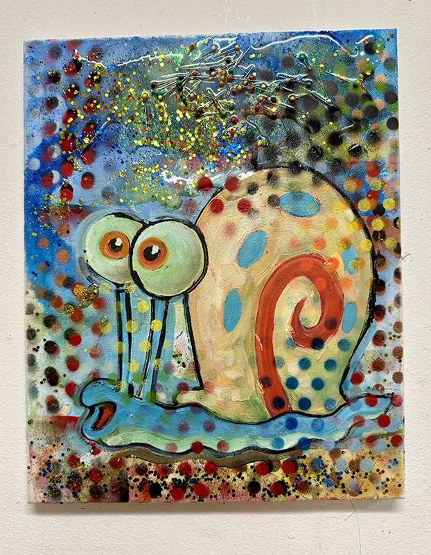 Huile, résine, hameçons, plumes, strass sur toile, 24x19cm |
