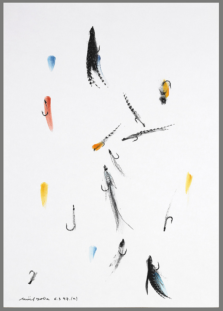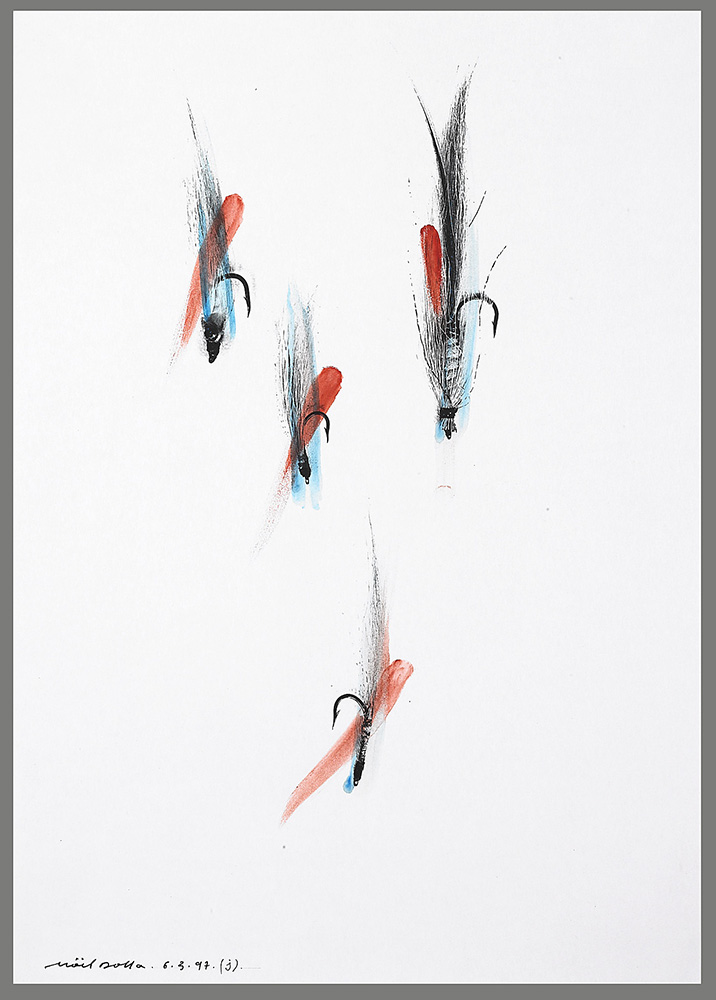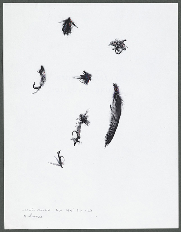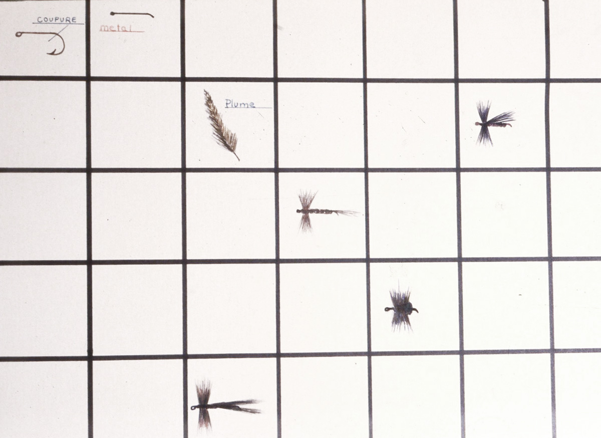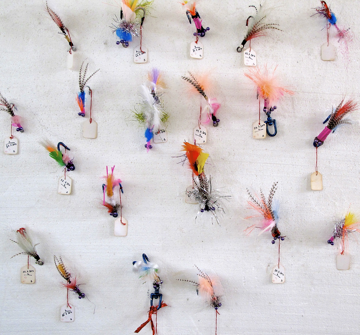 Hameçon, plumes, fils et perles, 25 x 15 cm |