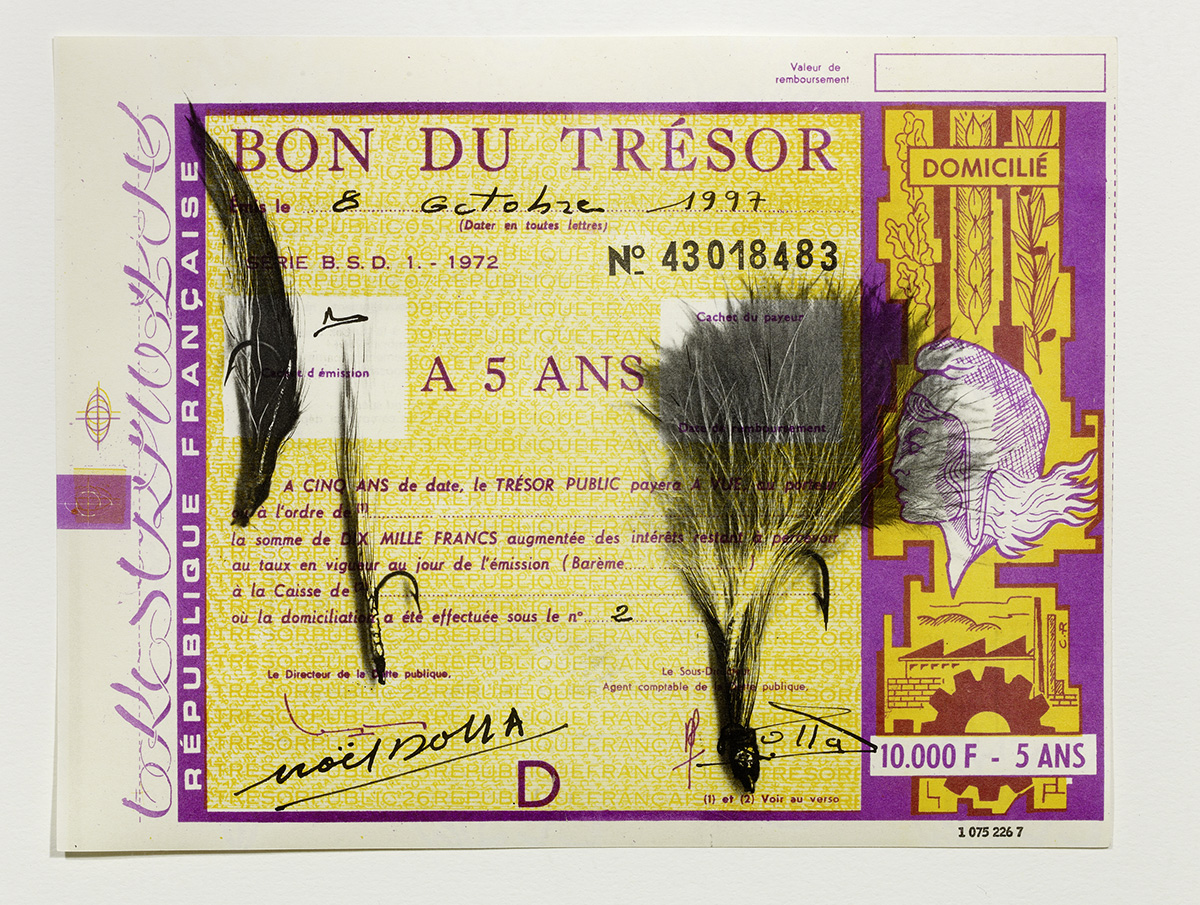 Carbone, encre de chine sur faux Bon du Trésor, 14,8 x 19 cm