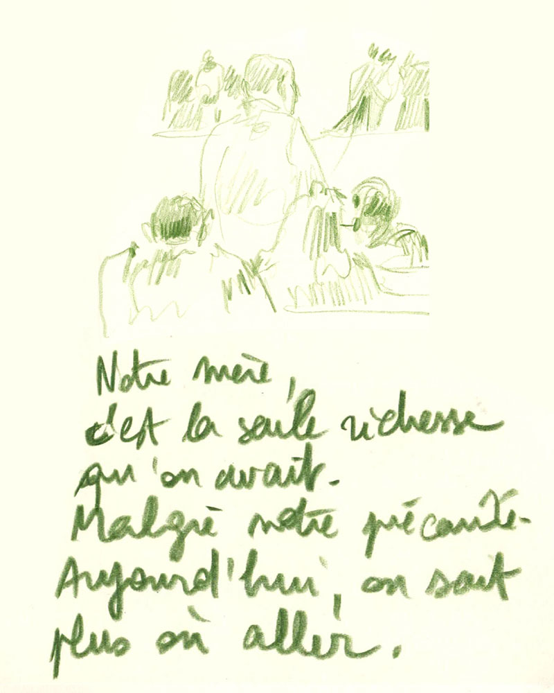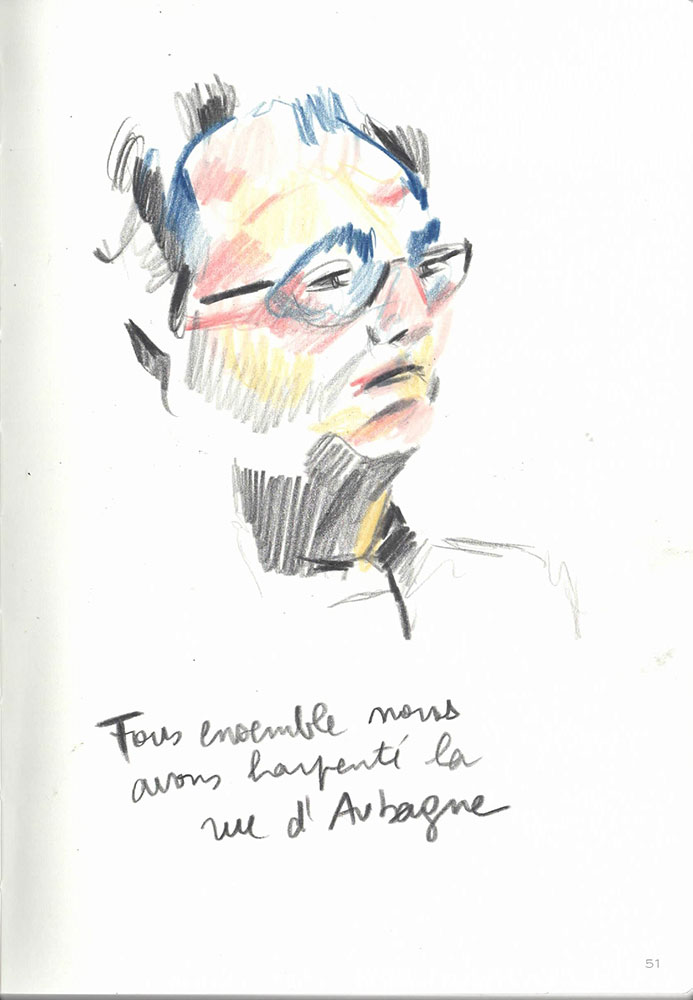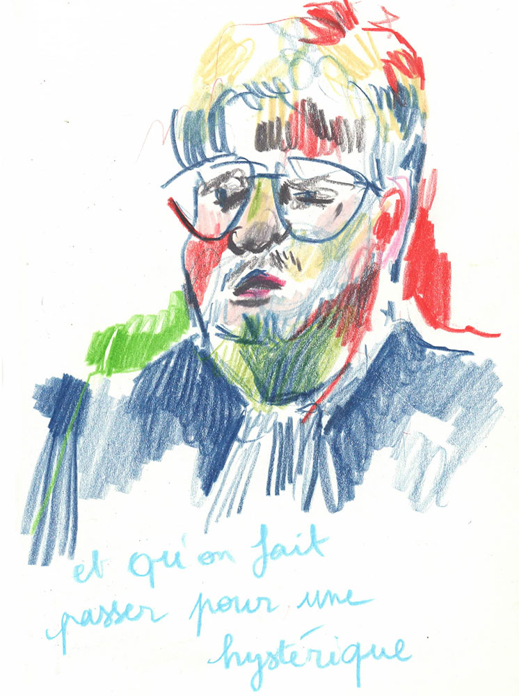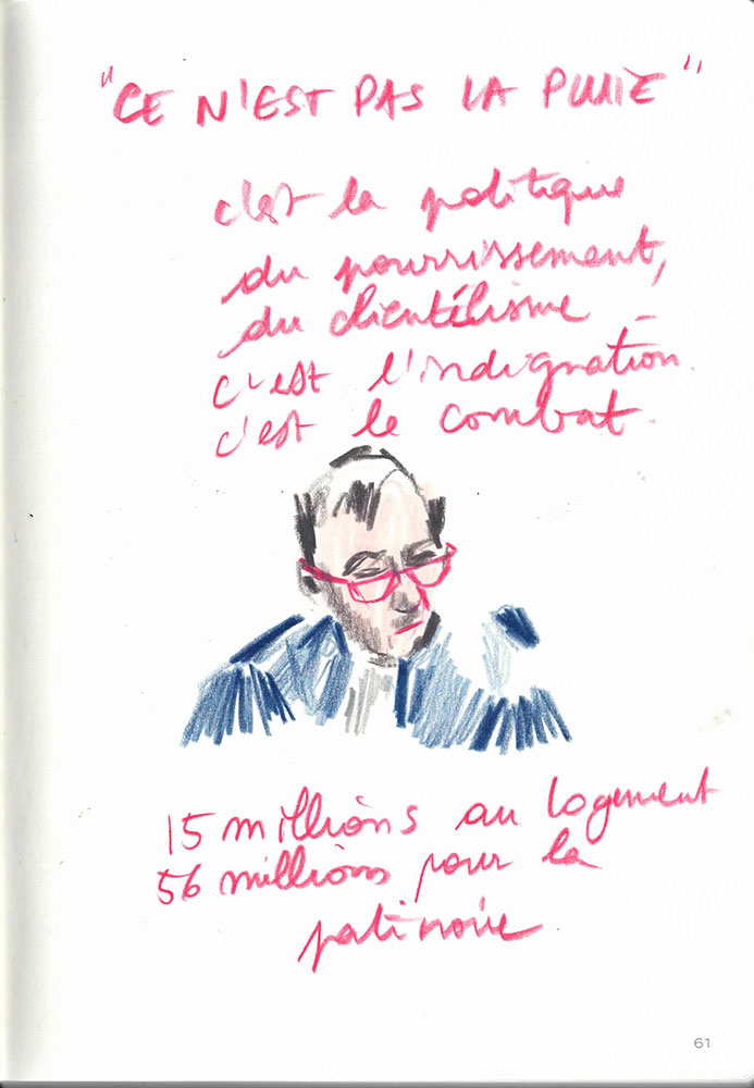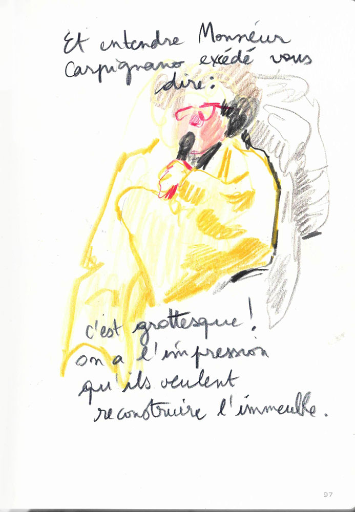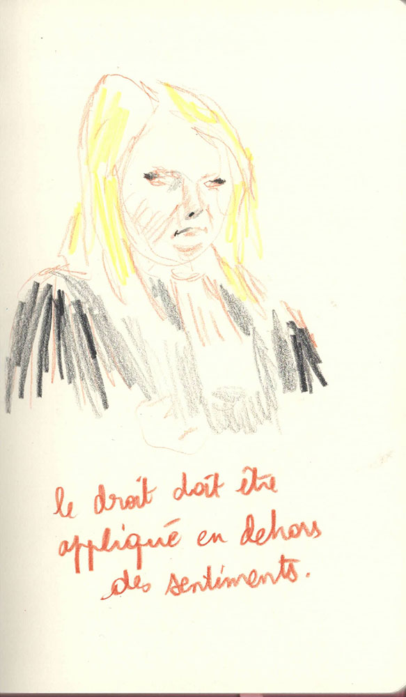 Un procès rassemble un groupe d’infortune à dessein d'écrire une histoire commune, la version reconnue d’un évènement. J’ai dessiné lors du Procès des effondrements des immeubles de la rue d’Aubagne dans la salle des procès hors norme du tribunal judiciaire de Marseille en contre-bas du président et des assesseurs, entre le greffier, le procureur et la traductrice, face aux parties civiles, au banc des accusés et à des nombreux avocats pour tenter de saisir ce qui est dit à la barre mais néanmoins en marge. Dans le recueil intitulé Marginalia, Edgar Allan Poe écrit :« La plus grande partie de la vérité est émise de façon impulsive, aussi, la plus grande partie de la vérité est parlée et non écrite ».