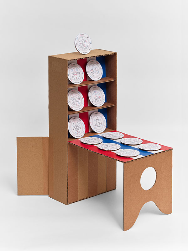 Notre présentoir s’inscrit dans cette histoire tout en la déplaçant. Il ne s’agit pas d’exhiber un rang social, mais de porter des paroles : les doléances de lycéens peintes sur les assiettes réalisées dans un atelier d’artisanat.